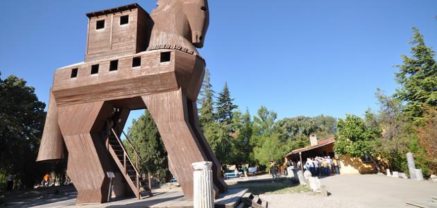 بعدما باءت محاولات حصار طروادة، واقتحام أسوارها بالفشل من قِبل اليونانيّين، وضع القائد أوديسيوس خطّةً تقتضي فضّ الحصار، وإهداء أهل طروادة حصاناً خشبيّاً ضخماً، ومُفرغاً، علماً بأنّ الحصان المُسمّى حصانَ طروادة كان يحتوي على عدد من المقاتلين اليونانيّين المُختبئين في داخله، فأدخل الطرواديّون الحصان إلى المدينة بعد المشاورات فيما بينهم، وأثناء الليلة التالية، خرج الجنود القابعون داخله، ثمّ احتلُّوا مدينة طروادة من الداخل لتنتهي بعدها الحرب.[٤]